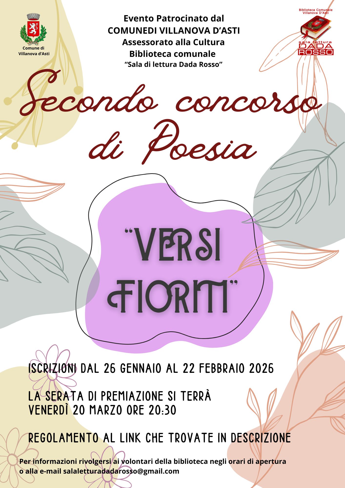 L’Assessorato alla Cultura e la Biblioteca Comunale "Sala di lettura Dada Rosso" invitano tutti i poeti e gli aspiranti tali a partecipare alla nuova edizione del premio letterario di Villanova d’Asti.